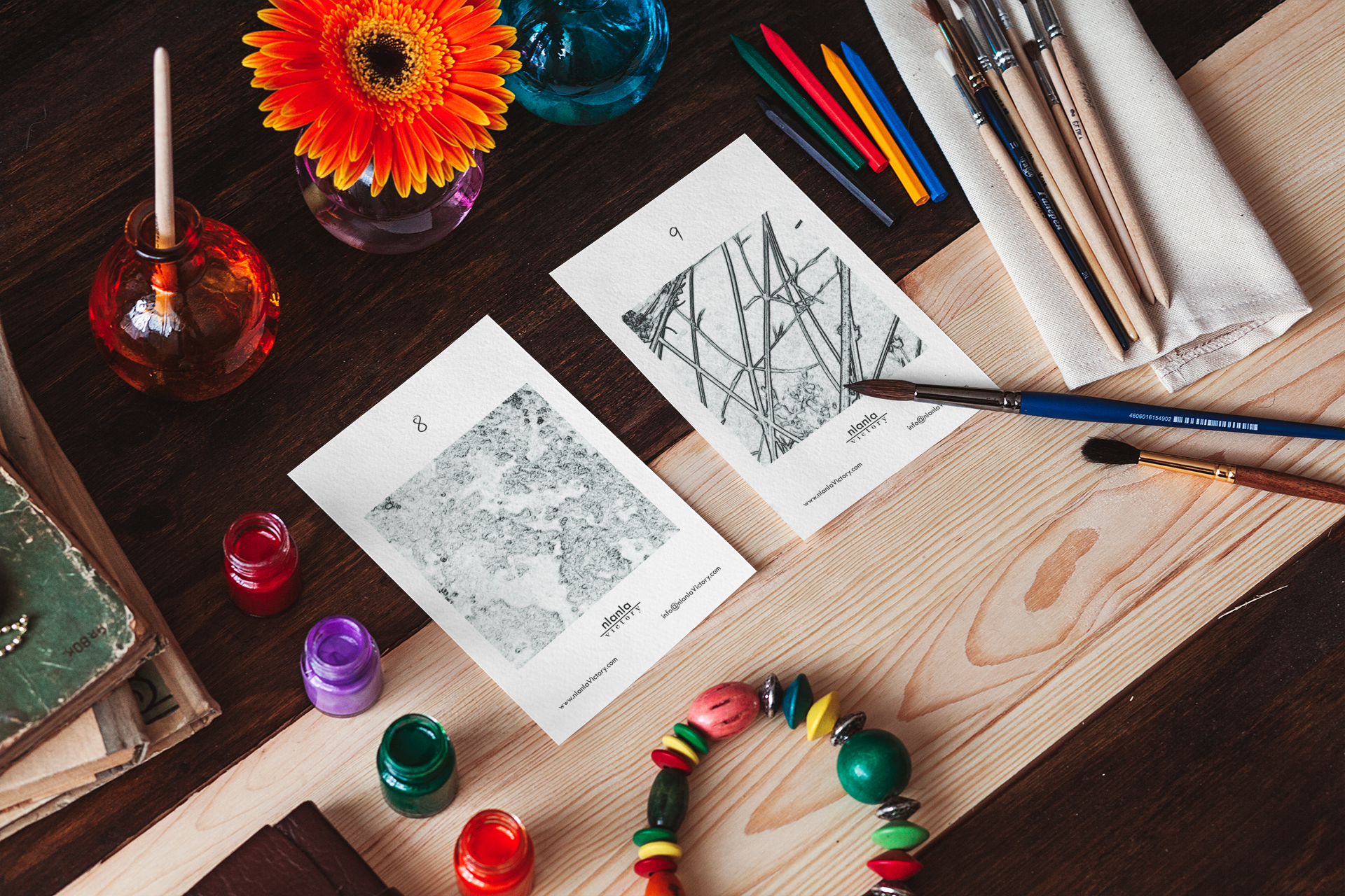 Victory in Wellness creativity kits, is a set of 12 original artwork cards which you can colour in with our speciality paints. The set of cards come in a large blue organza bag. Each kit is complete to produce a finished product. I’m an artist so sketch, design and engrave all the designs myself.